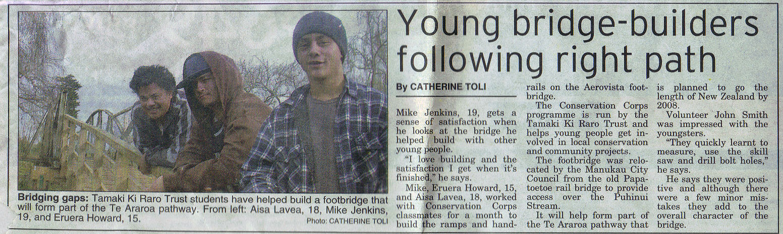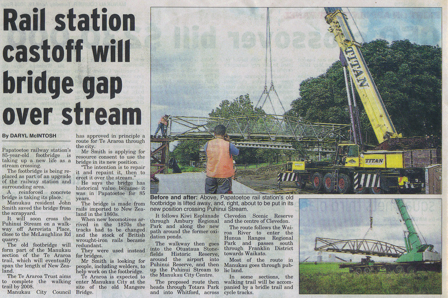 Click here to see a newspaper clipping from the Manukau Courier (April 2005) relating to the moving of the old Papatoetoe rail footbridge to be used as a stream crossing for the Puhinui Stream Trail (850kB jpg image, opens in new window).